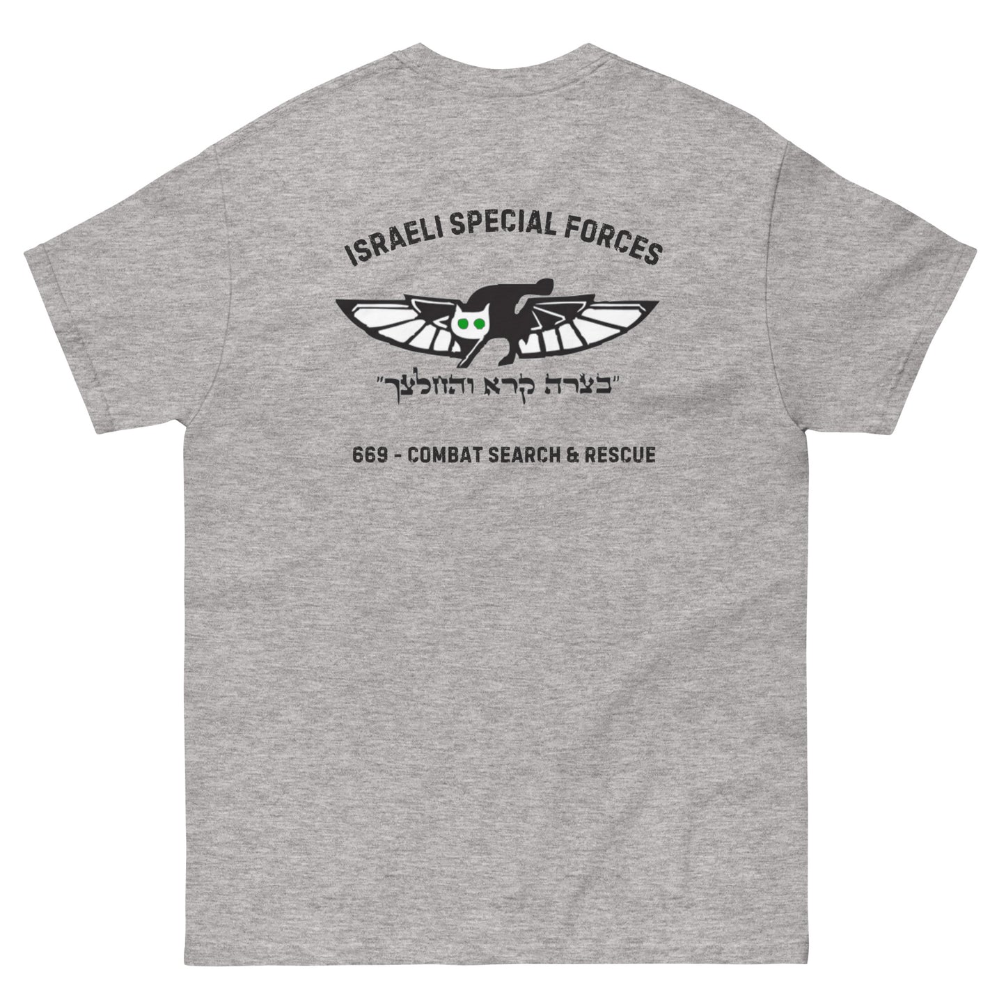 Show your admiration for the heroic Unit 669, the IDF's elite Combat Search and Rescue unit, with this premium t-shirt. Featuring a bold graphic print of the unit’s logo on the back and a meticulously embroidered emblem on the front, this 100% cotton men’s classic tee delivers both style and authenticity. Its structured fit and clean lines make it a versatile addition to your streetwear or casual wardrobe.