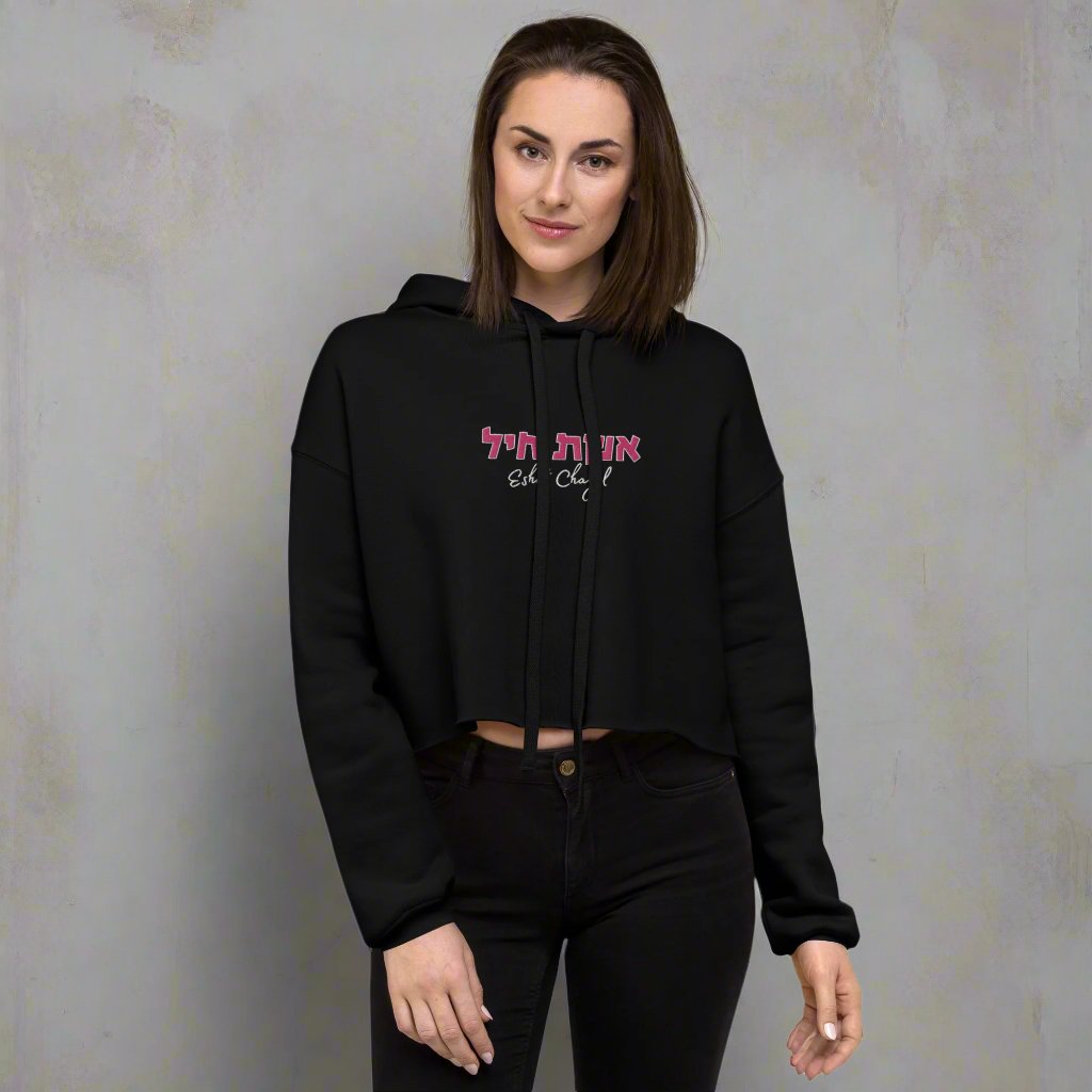 "Eshet Chyail" in hebrew would be the equivalent to a mensch if telling a women Let fashion take over your wardrobe with this great statement piece. The trendy raw hem and matching drawstrings means that this hoodie is bound to become a true favorite.
