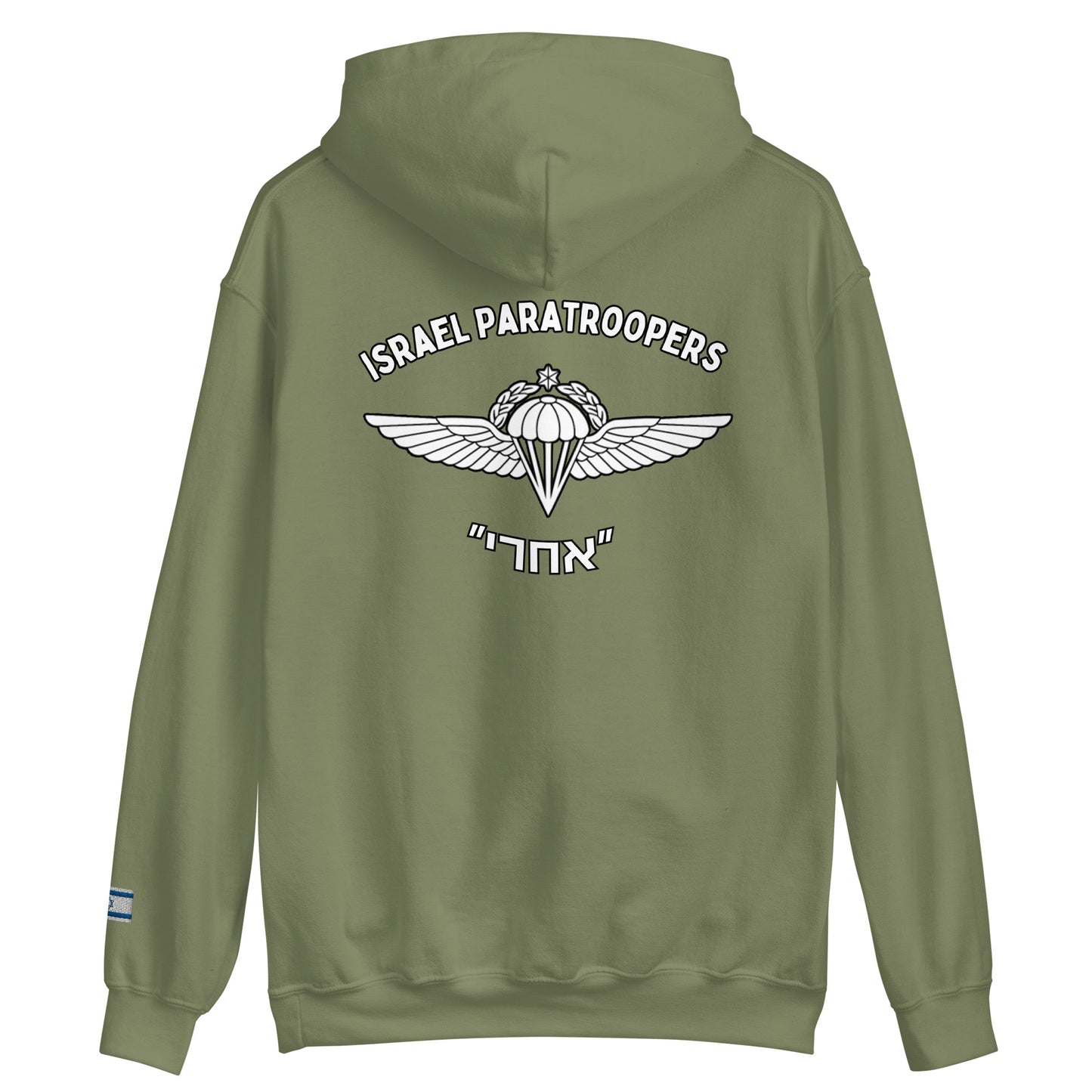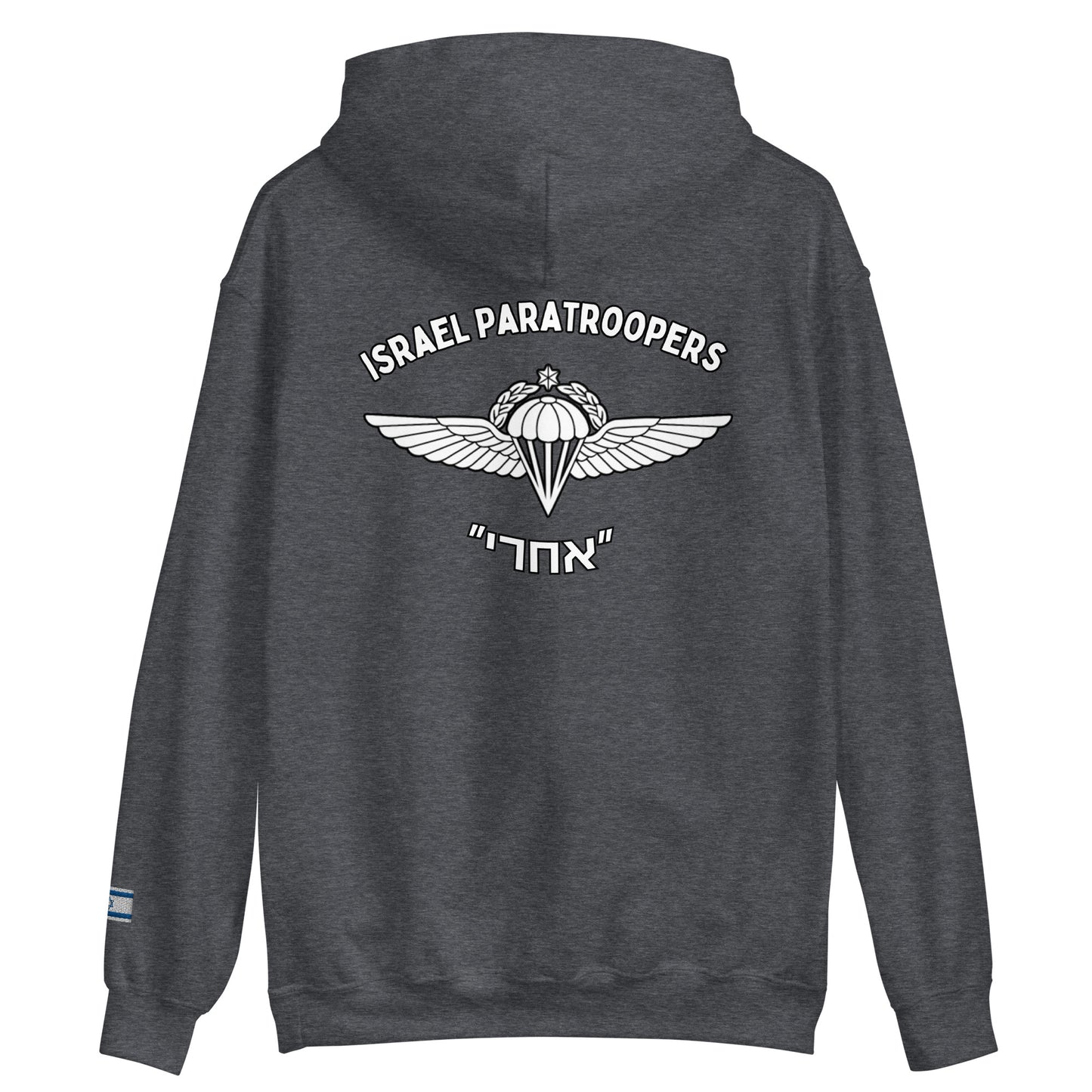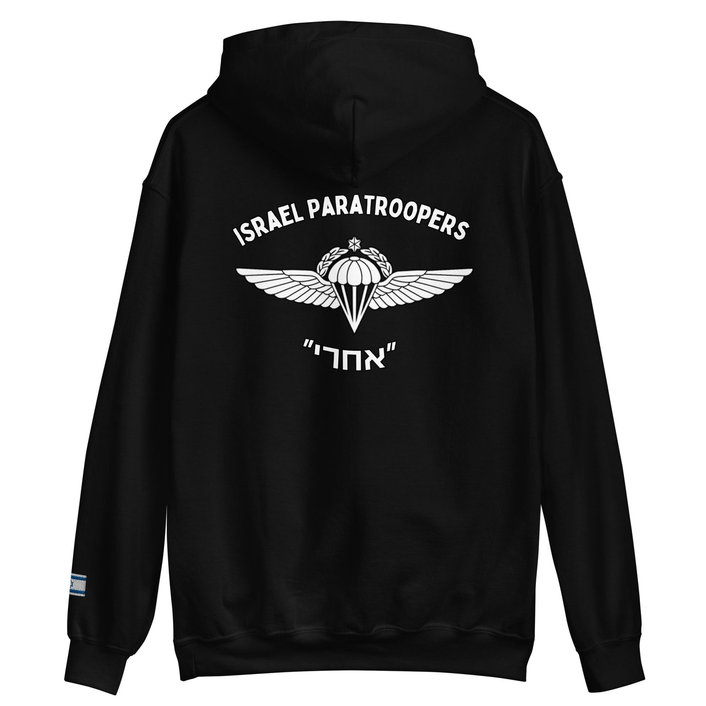 Show your pride for the legendary IDF Paratroopers with this classic hoodie, featuring an embroidered unit logo on the chest, an Israeli flag embroidered on the left sleeve and a graphic print of the paratroopers moto "follow me in hebrew" . Soft, smooth, and stylish, this cozy hoodie is perfect for cooler evenings or casual wear.