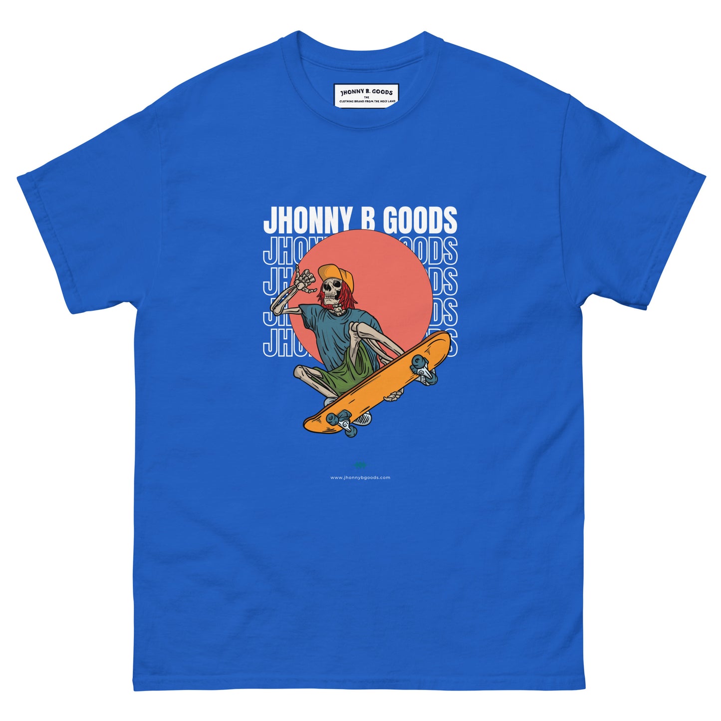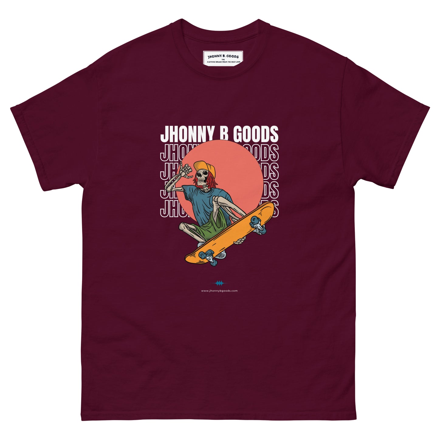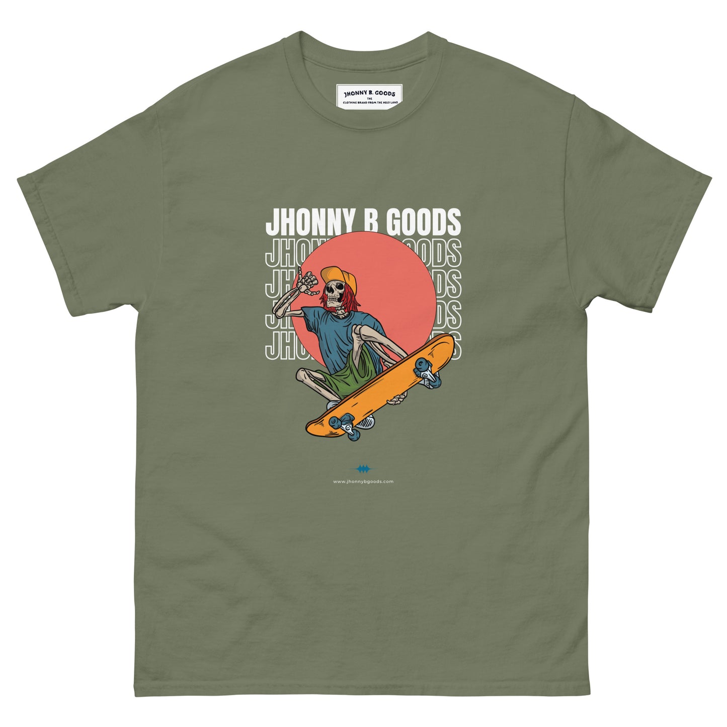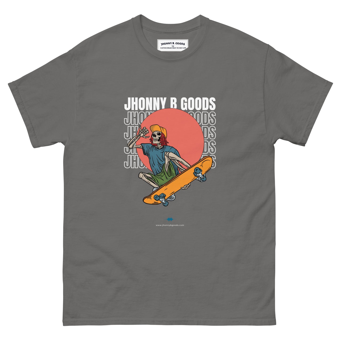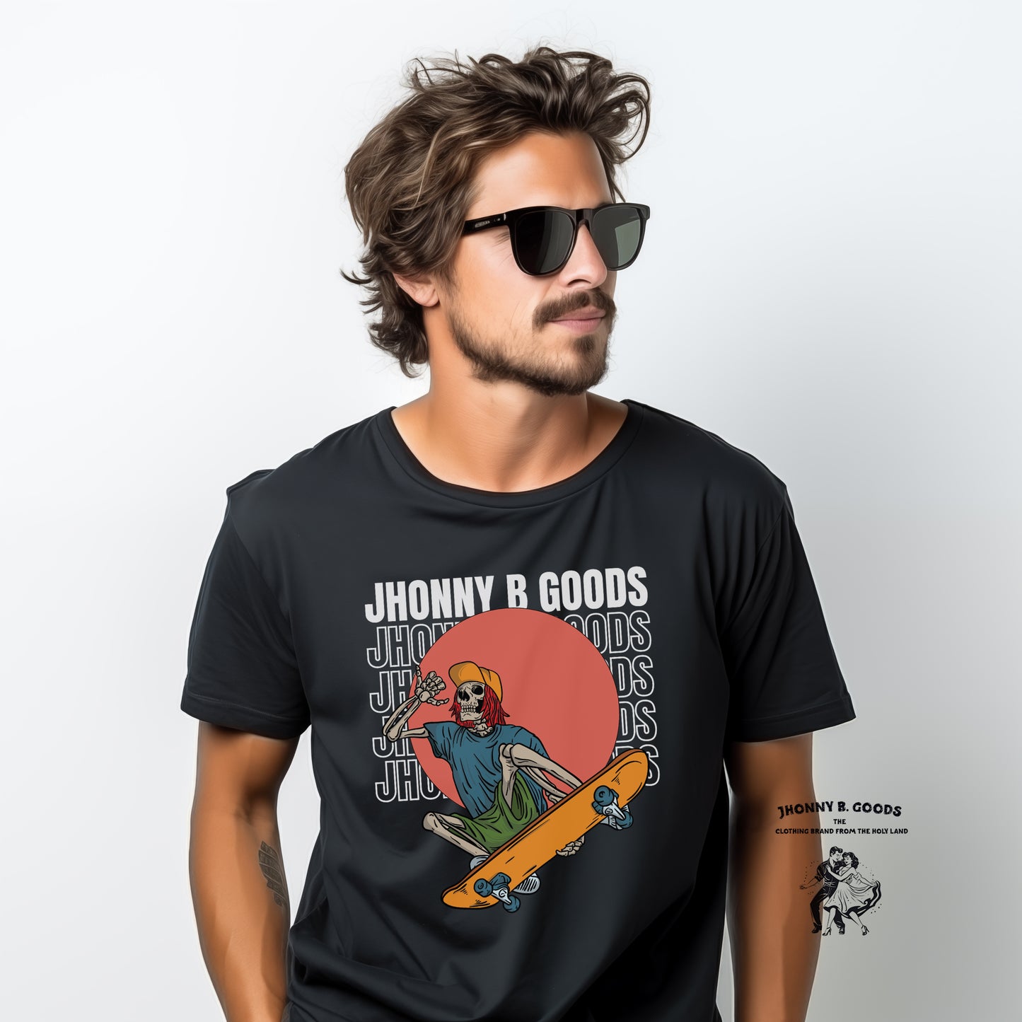 Upgrade your skateboarding style with the JBG Skateboarding Men's classic tee. Crafted with 100% cotton, this tee offers a structured fit and sharp lines for a polished look. Perfect for layering with streetwear outfits, the jhonny b goods graphic skater skeleton adds an edgy touch. Get extra trendiness now!