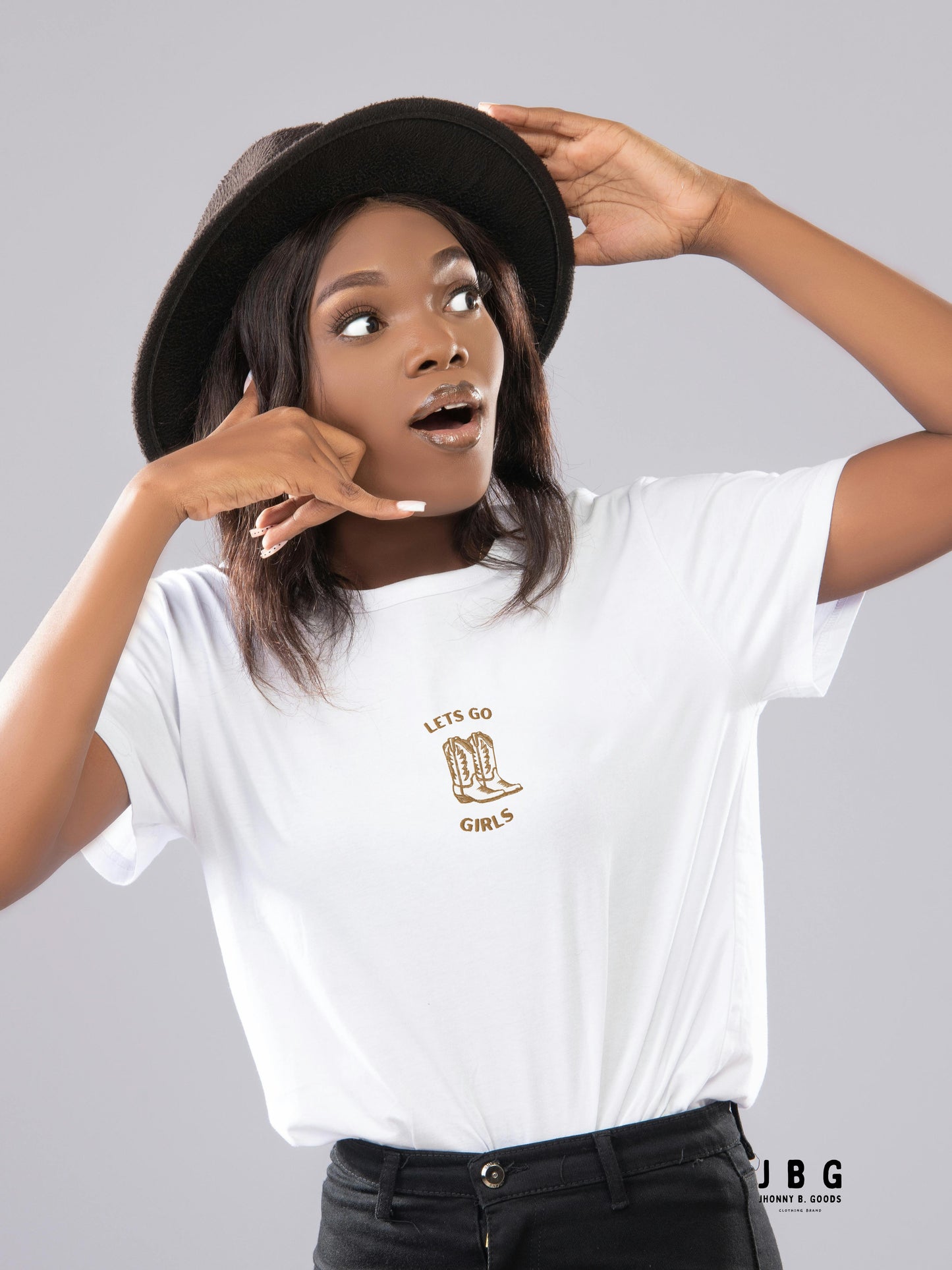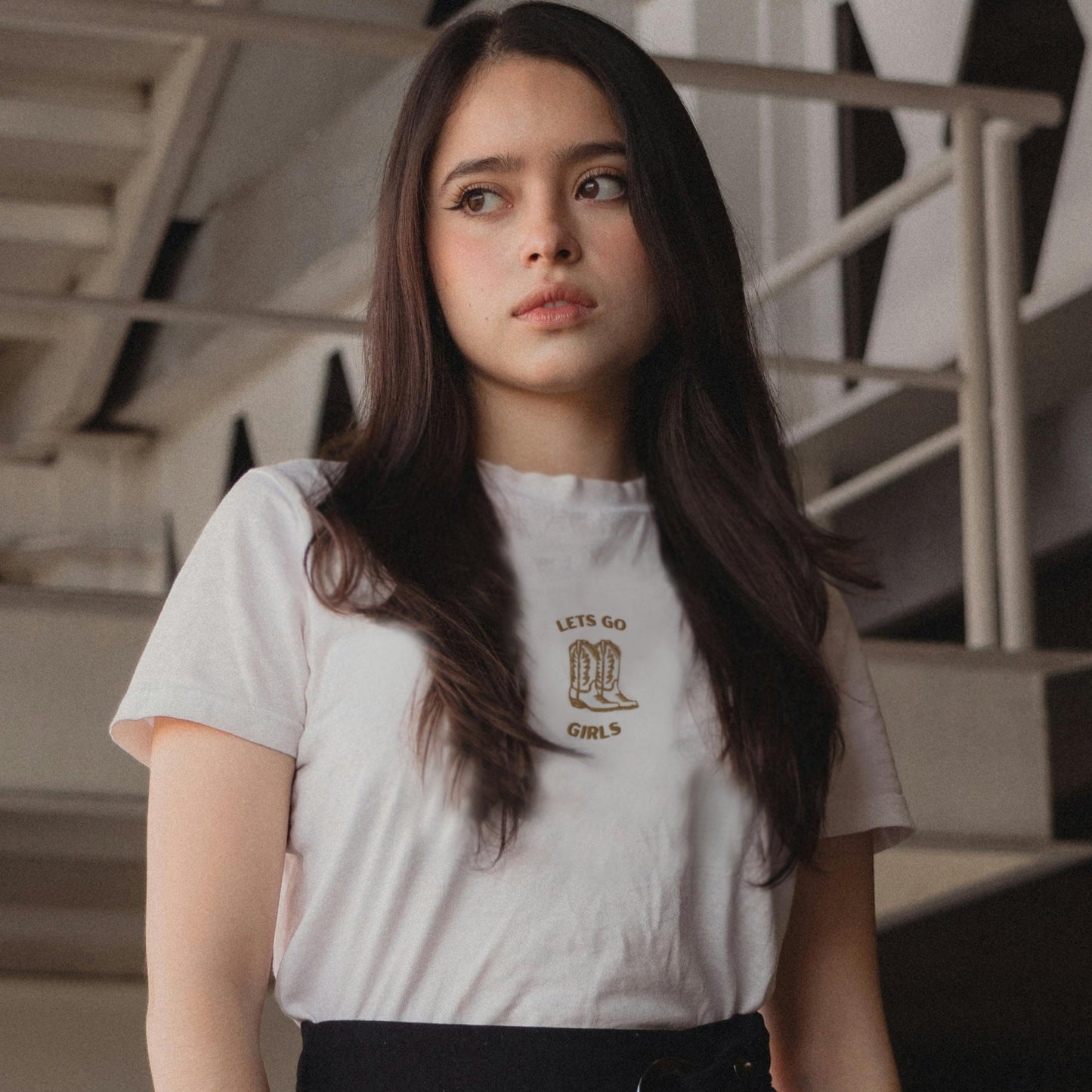Elevate your wardrobe with our Lets Go Girls Embroidered T-Shirt. Made with 100% ring-spun cotton, this staple piece is soft and comfortable. The double stitching on the neckline and sleeves adds durability, making it a favorite for years to come. Seize the day in style.