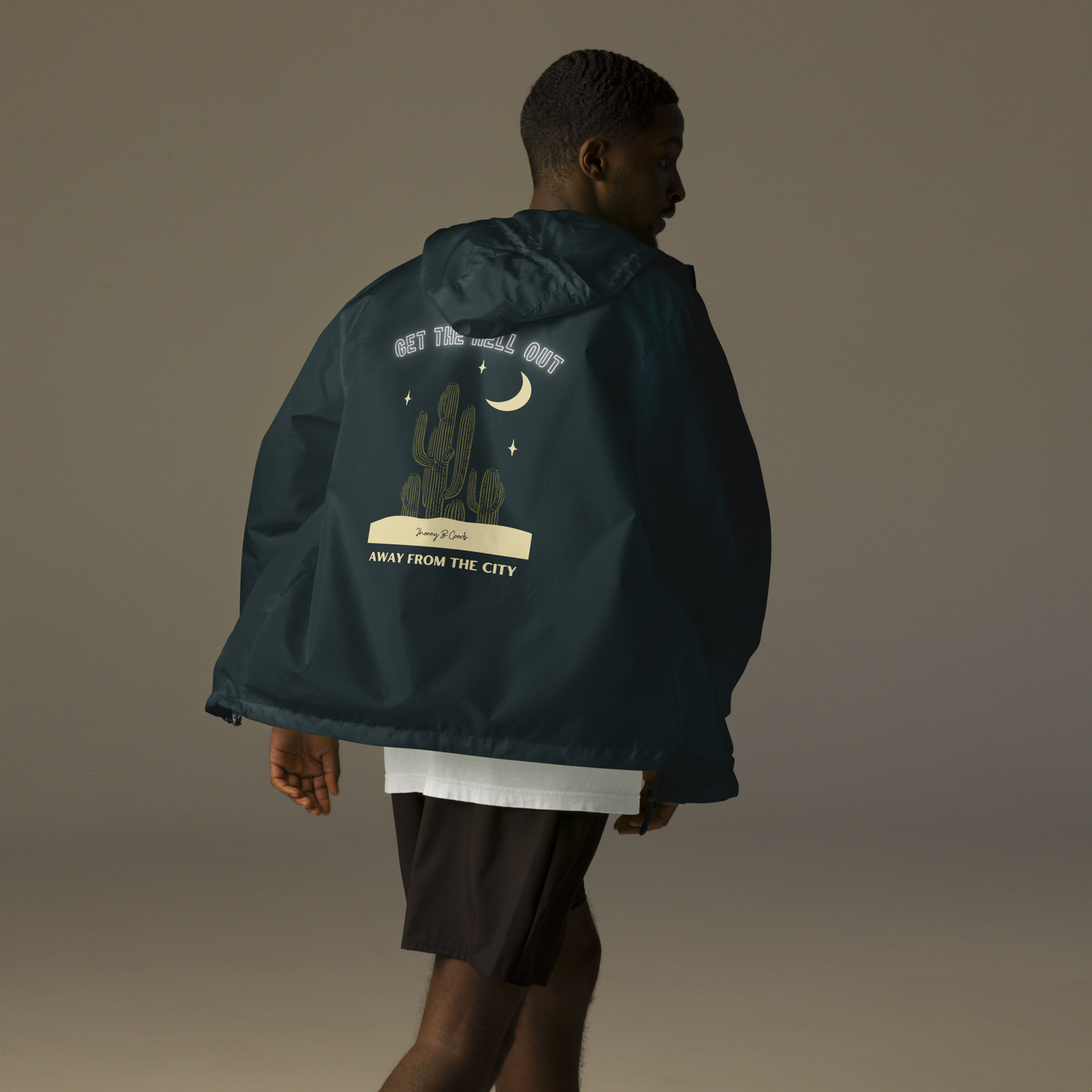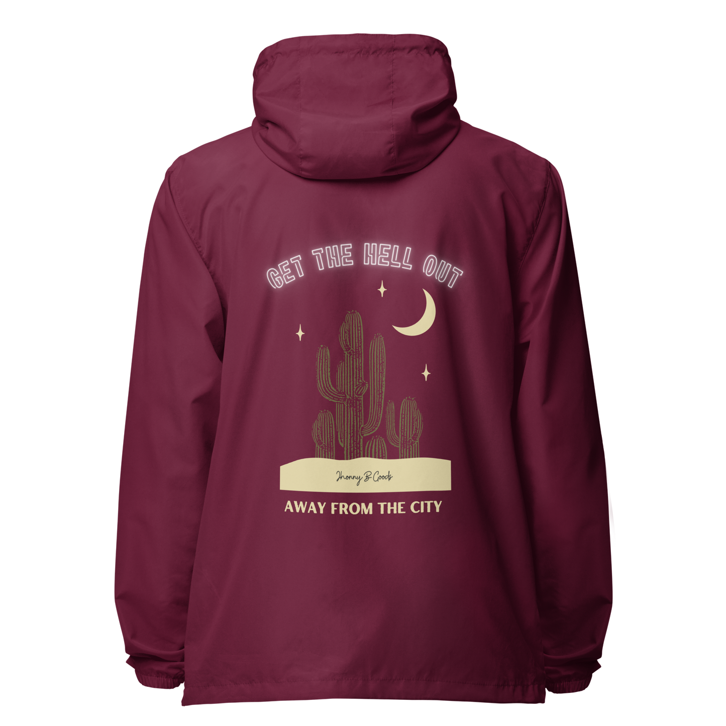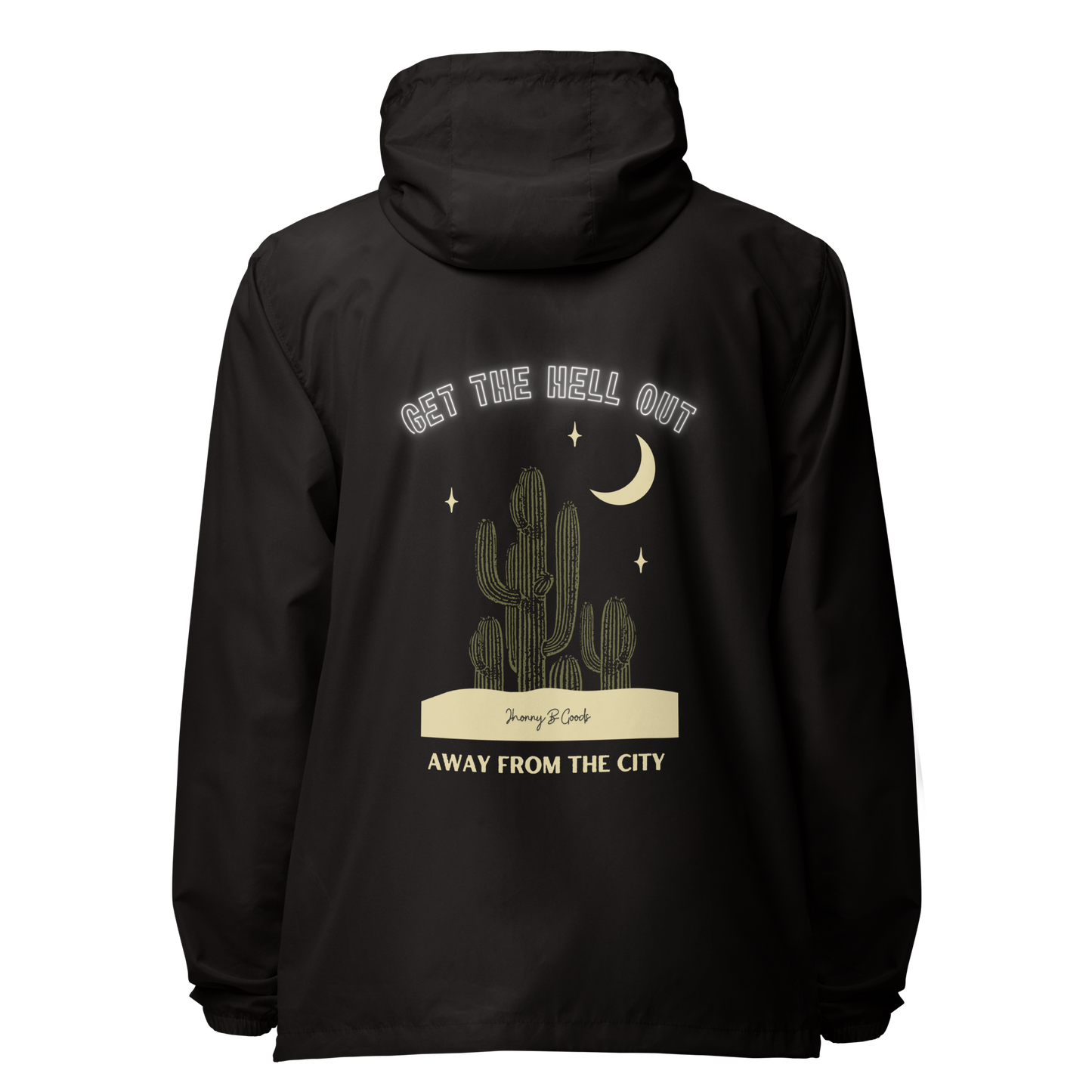 Escape the hustle and embrace the outdoors with this "Get Away From The City" graphic windbreaker. Featuring a striking back print, this jacket is as light as a feather and perfect for any outdoor adventure.