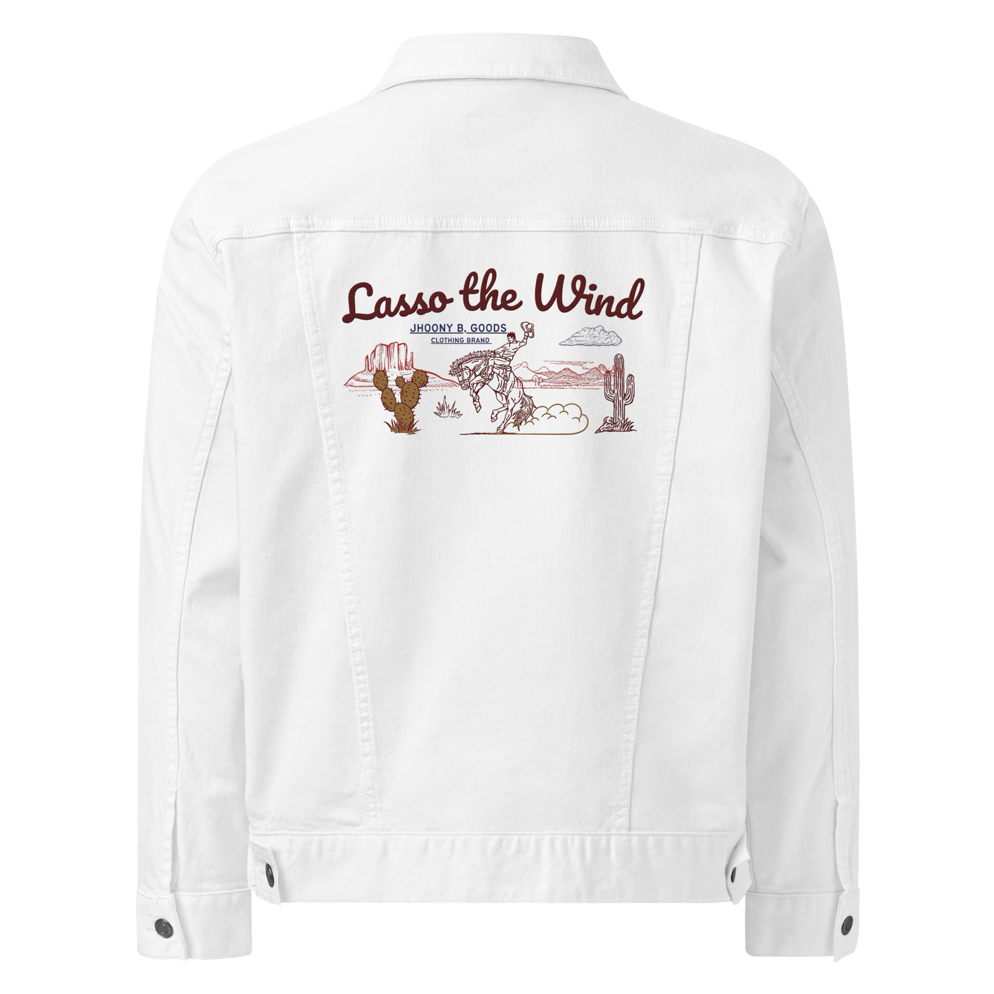 This iconic denim jacket features "Lasso The Wind" embroidered on the back with a cowboy riding through the desert, embodying the untamed essence of Wild West culture. Perfect for layering over a t-shirt or hoodie, this durable piece brings rugged charm and timeless style to any outfit, making it a true wardrobe staple.
