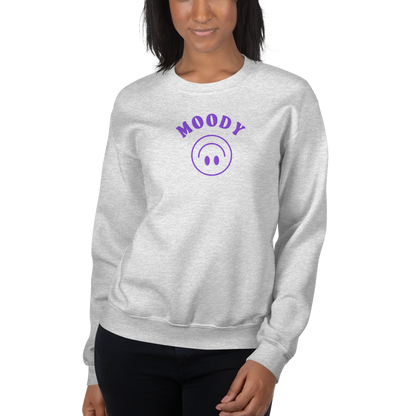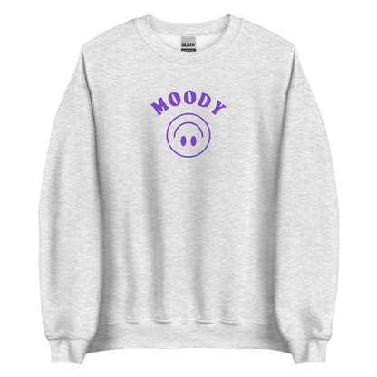 Embrace your vibe with this uniquely designed crewneck, featuring a playful "Moody" embroidery with an upside-down smiley face centered on the chest.
