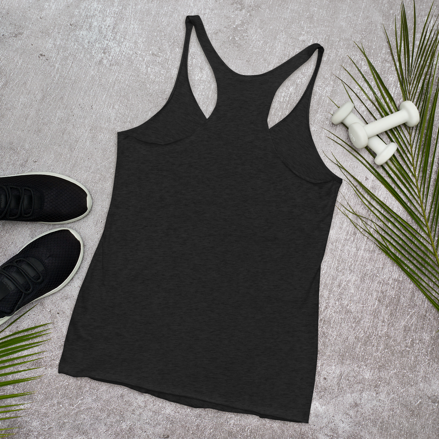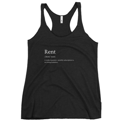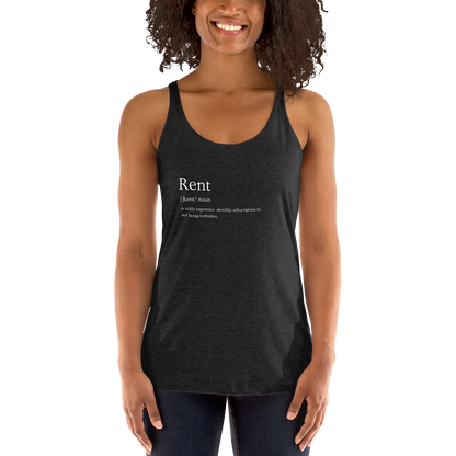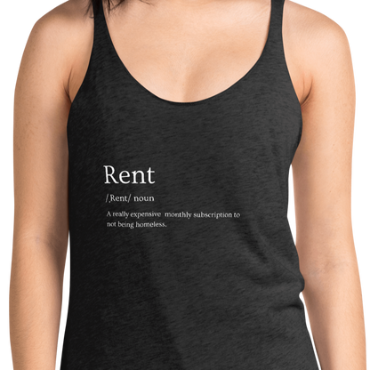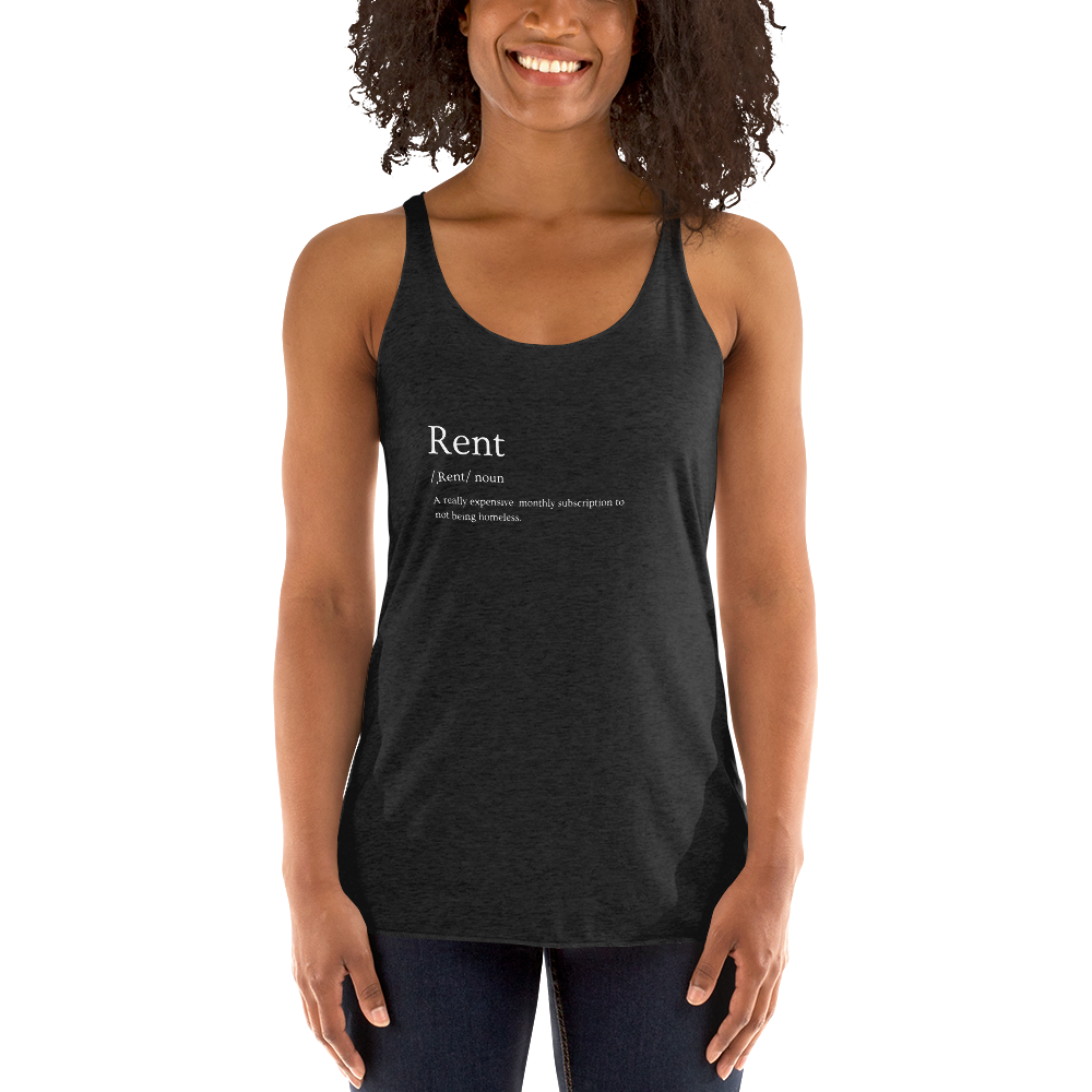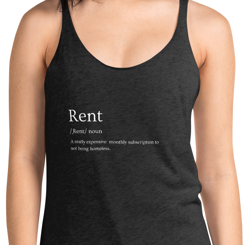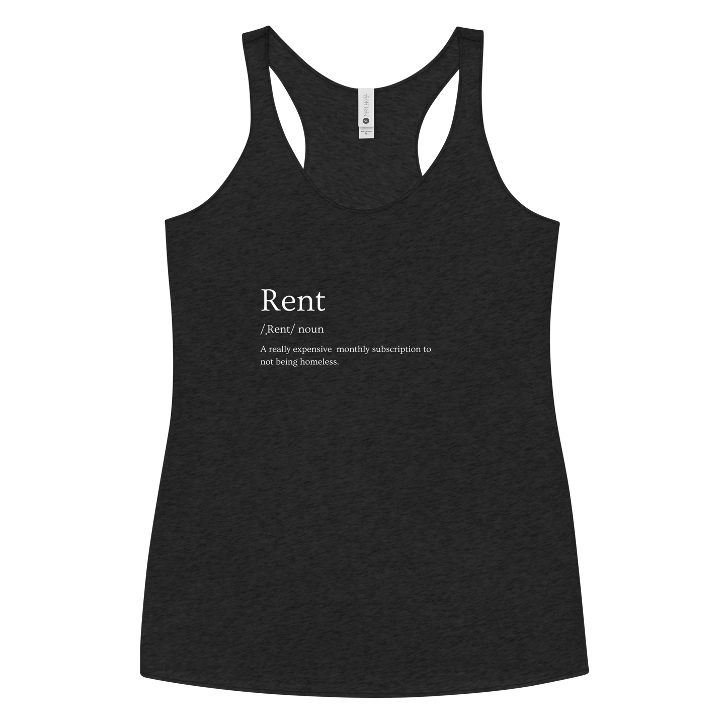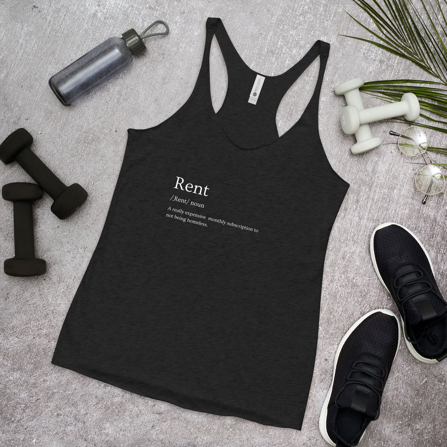Stay stylish and witty with this women's racer tank its soft, lightweight, and form-fitting with a flattering cut and raw edge seams for an edgy touch. featuring a bold and funny print about rent struggles. Perfect for casual wear, this soft and breathable tank keeps you cool while making a statement—because rent is too damn high, and laughter is free!