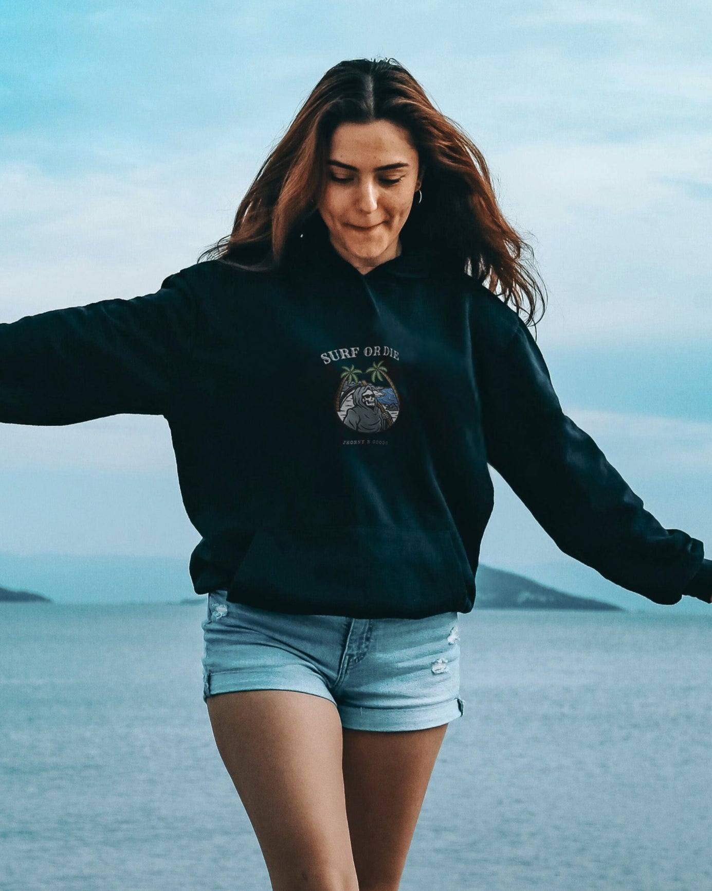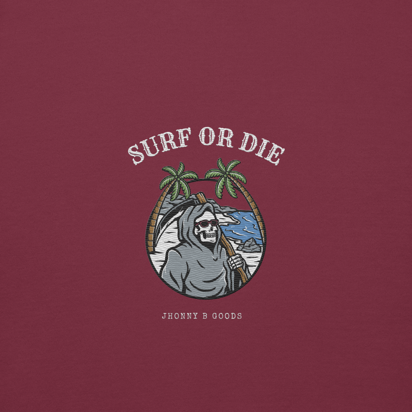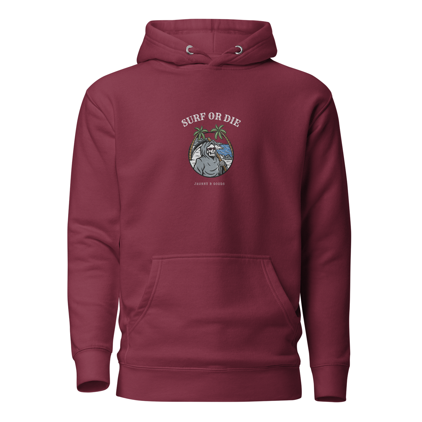 Women’s Heavyweight Premium Hoodie – Embroidered Design & "Surf or Die" Skeleton Graphic | JBG Surf & Skate Collection