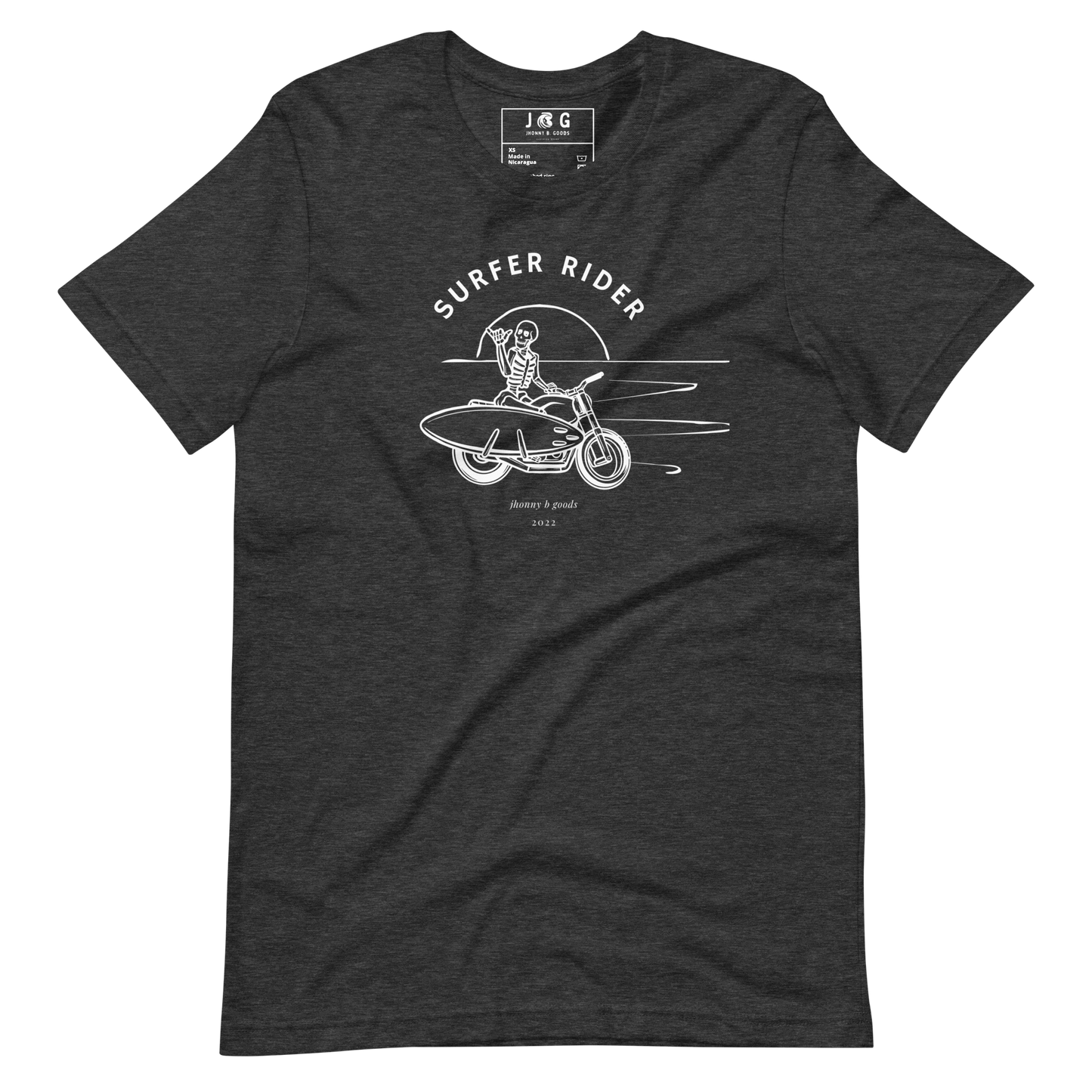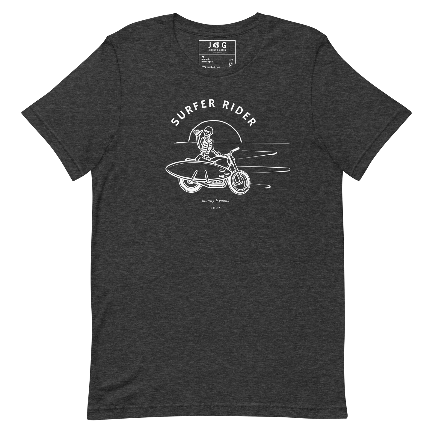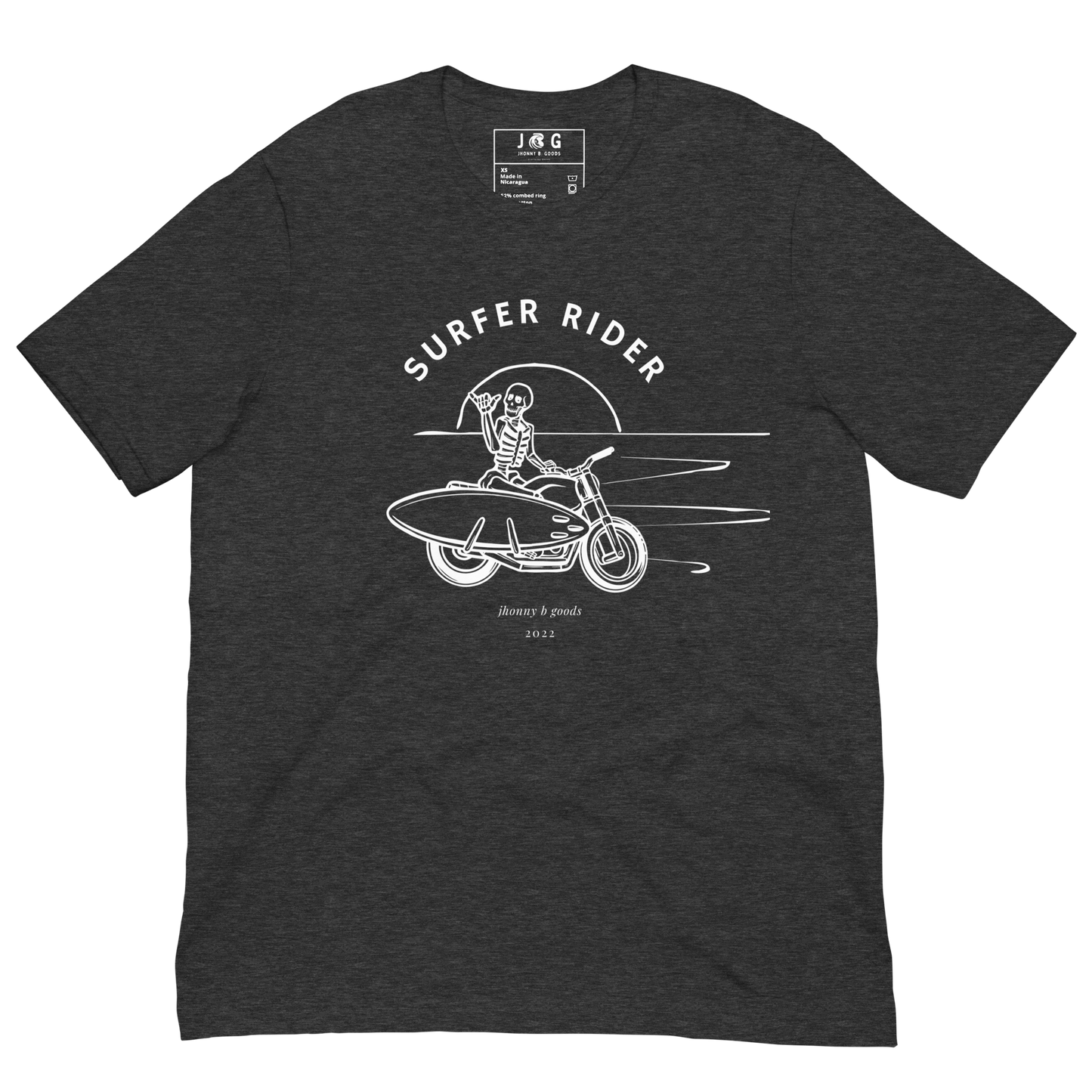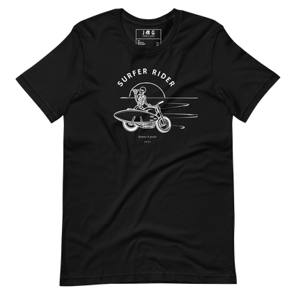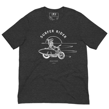 Live life on the edge with our Skeleton Surf Rider Tee, featuring a bold graphic of a skeleton riding a motorcycle while clutching a surfboard on the chest. Part of JBG’s Women’s Surf & Skate Collection, this lightweight, ultra-soft tee is for the rebels, the wave riders, and the free spirits who blend surf culture with a touch of punk attitude.