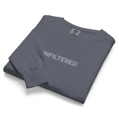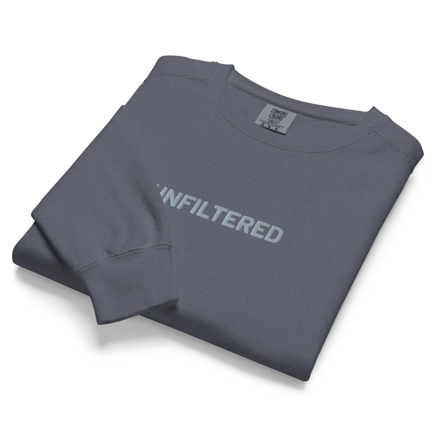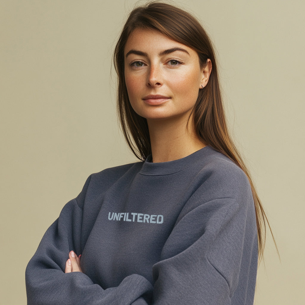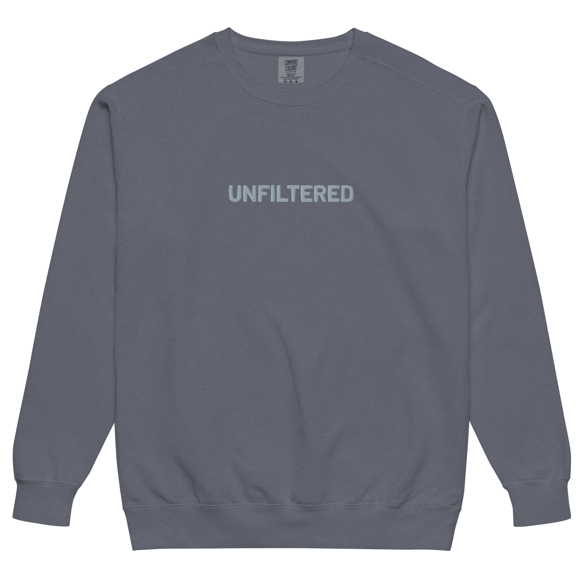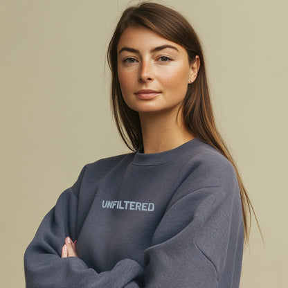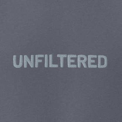 Raw, real, and unapologetic—the “UNFILTERED” embroidered sweatshirt from our Unfiltered Collection is all about embracing who you are, no edits needed. This vintage-washed denim-colored sweatshirt delivers a soft, worn-in feel and a relaxed fit, making it as effortless as it is bold. The center chest embroidery is a reminder to speak your truth, live authentically, and ditch the masks. Whether you're outspoken or just love a statement piece, this sweatshirt is made for those who refuse to be censored.