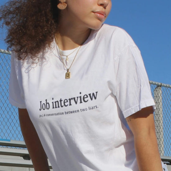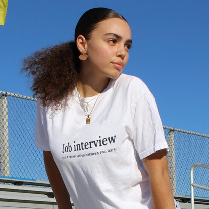 Elevate your "professional" attire with our Job Interview Women's high-waisted t-shirt. Featuring a funny job interview meme, this shirt adds a touch of humor to your outfit. Made with high-quality materials, it offers both comfort and style. Perfect for any job seeker or industry expert.